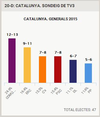 TV3 ha publicat el seu sondeig en què mostra els resultat obtinguts a Catalunya. Segons aquests, En Comú Podem obtindria entre 12 i 13 escons amb un 24’9% d’intenció de vot, seguit per ERC que n’obtindria entre 9 i 11 amb el 16’4%.
