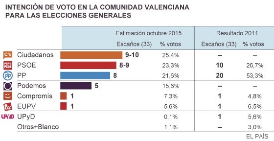 El diari El País va llançar anit una enquesta d’intenció de vot i possible repartiment dels 33 escons que corresponen al País Valencià per a les eleccions del 20D en el Congrés dels Diputats amb el següent resultat:
