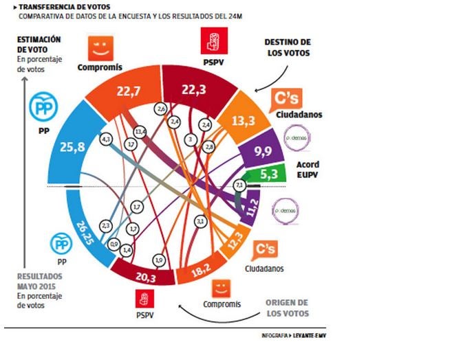 Per primera vegada Compromís superaria en percentatge de vot el PSPV (22,7 % enfront del 22,3 %) encara que tots dos empatarien a escons: 23 cadascun i la suma de tots dos es quedaria a quatre de la majoria absoluta.