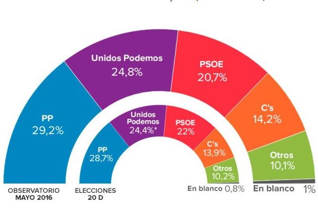Segons l’estimació de vot del sondeig, el PP tornaria a guanyar les eleccions, encara que els percentatges de suport electoral es mouen alguna cosa des dels últims comicis. El PP obtindria un 29,2% dels vots. Puja mig punt des de desembre. En segon lloc ja no estaria el PSOE, sinó Unidos Podemos amb un 24,8%, xifra que millora lleugerament, quatre dècimes, la suma de Podemos i IU en les passades eleccions.