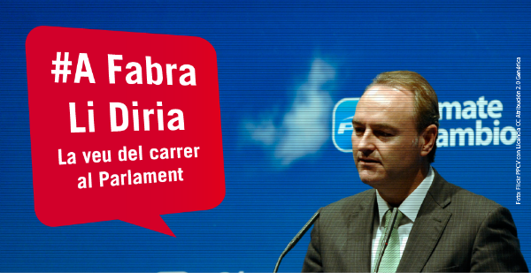 La campanya #AFabralidiria reprèn el testimoni de la què IU ja posà en marxa el passat mes de febrer amb motiu del Debat de l’Estat de la Nació, sota el títol #ARajoylediria. “Aquella campanya funcionà molt bé, amb moltíssimes aportacions dels ciutadans, i ara volem el mateix a nivell autonòmic. Esquerra Unida vol ser la veu del carrer, i aquesta és una eina més per aconseguir-ho”, ha explicat el portaveu adjunt d’EUPV en Les Corts, Ignacio Blanco.