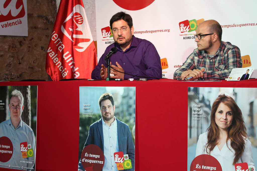 El candidat d’EUPV a la Presidencia de la Generalitat, Ignacio Blanco, i el responsable de comunicació interna i xarxes socials, Fede Sabater, han presentat aquest matí en roda de prensa la imatge de la campanya de la coalició liderada per Esquerra Unida.