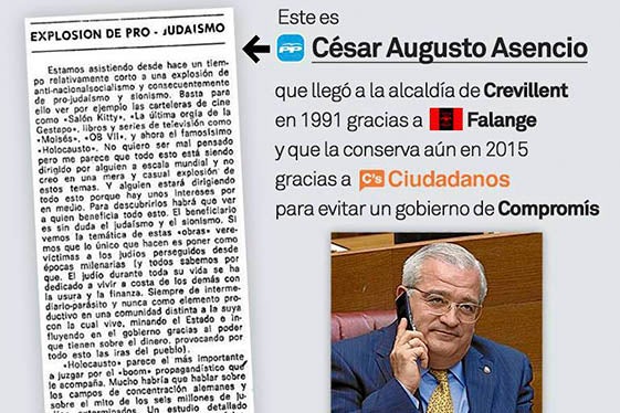 En l’article publicat al juliol de 1980 pel diari Información l’actual alcalde de Crevillent manifestava que “el jueu durant tota la seua vida s’ha dedicat a viure a costa dels altres”. Igualment, qüestionava l’assassinat de sis milions de persones en els camps de concentració sobre la base “d’un estudi detallat que ens mostra que és fals”.