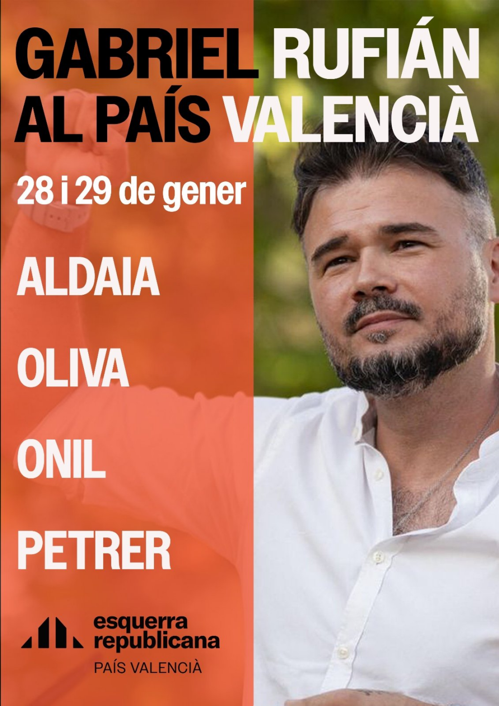 Esquerra Republicana del País Valencià (ERPV) ha anunciat la visita del diputat i portaveu d’Esquerra Republicana al Congrés, Gabriel Rufián, a Aldaia (l’Horta Sud) el 28 de gener, i a Potries (la Safor), Onil (l’Alcoià) i Petrer (el Vinalopó Mitjà) el 29 de gener. Amb aquesta ruta el partit vol reforçar el contacte amb el territori.