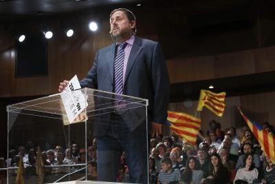 El líder d’Esquerra Republicana de Catalunya, Oriol Junqueras, ha comparegut satisfet, després que el president de la Generalitat, Artur Mas, haja signat el decret de convocatòria de la consulta del 9 de novembre.