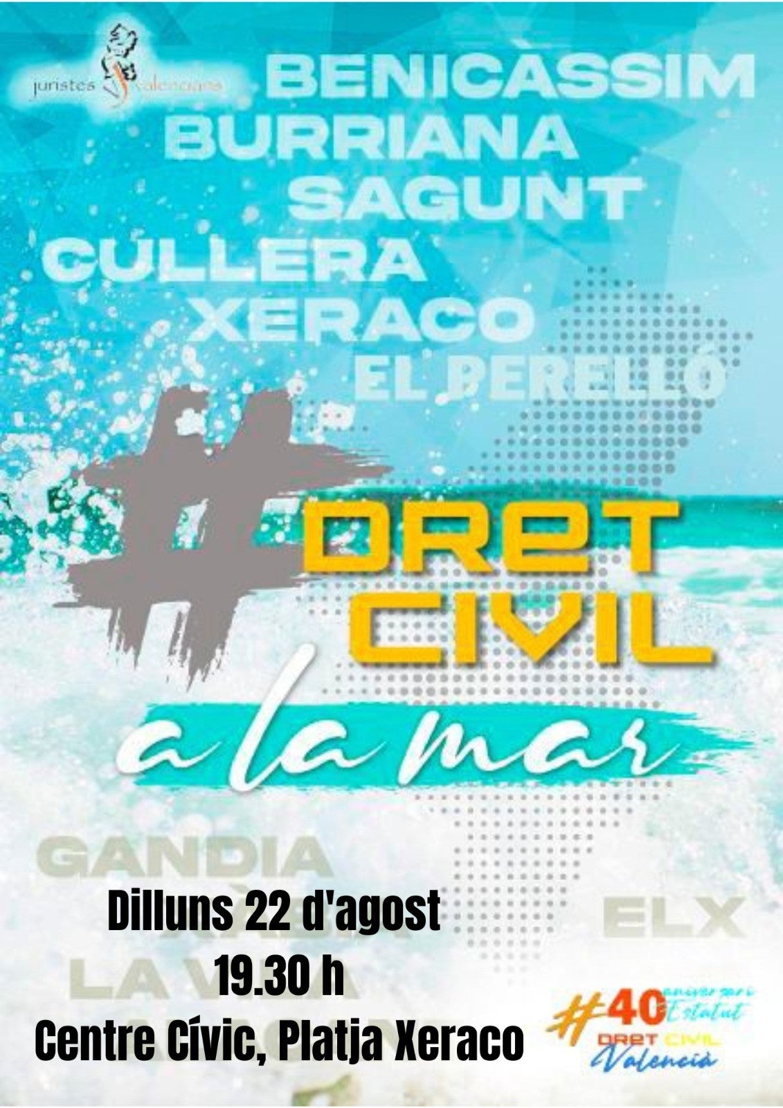 L’acte, que s’insereix dins del cicle divulgatiu «Dret Civil a la Mar 2022», realitzat en localitats del litoral valencià, arriba a Xeraco, a la Safor, després de «l’èxit» de la conferència similar impartida a Gandia, a la seu de l’entitat Foment d’Agricultura, Indústria i Comerç de la capital de la Safor el passat 28 de juliol.