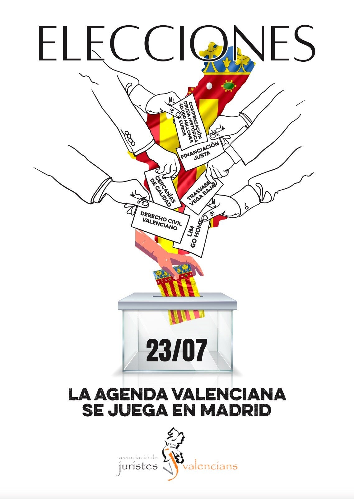 Amb motiu de l’inici de la campanya electoral per a les eleccions espanyoles del 23 de juliol, Juristes Valencians ha sol·licitat els dirigents del PP, del PSOE i de Compromís-Sumar que donen resposta a les necessitats de les valencianes i dels valencians. Amb aquest objectiu, l’associació ha presentat la campanya «L’Agenda Valenciana es juga a Madrid», amb un cartell en el qual identifiquen algunes de les qüestions essencials –segons parer de l’entitat– d’aquesta agenda que pretenen que es resolguen al Congrés, al Senat i als ministeris.