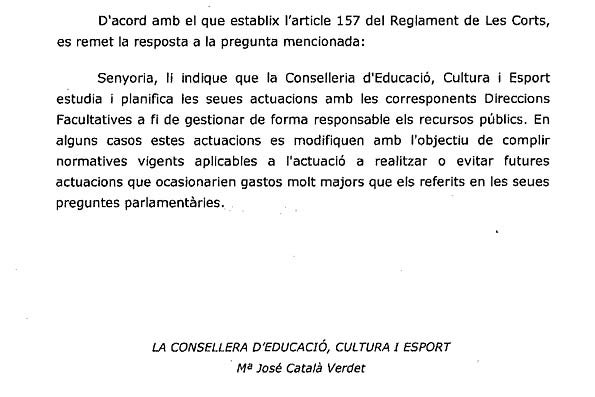 La resposta de Català afirma: “La Conselleria d’Educació, Cultura i Esport estudia i planifica les seues actuacions amb les corresponents direccions facultatives a fi de gestionar de forma responsable els recursos públics.