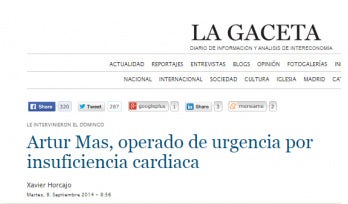 Desesperació i intoxicació sense límits a la caverna a pocs dies de la Diada històrica. La Gaceta anuncia que el president Mas ha estat operat d’urgència aquest passat diumenge per insuficiència cardíaca. L’article signat per Xavier Horcajo vincula la malatia del president, desmentida, a les exigències del PP i Ciudadanos perquè el president comparegui al Parlament pel cas Pujol. La Generalitat hauria desmentit la informació a esRadio segons informa Libertad Digital. Aquests dies la caverna és un festival d’intoxicacions i l’ANC i Mas són els principals blancs amb informacions inventades i sense sentit que es reprodueixen i s’escampen per la xarxa amb l’objectiu de desmobilitzar el que serà la major mobilització de la història.