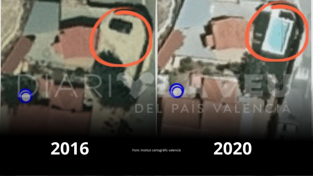 L’estudi comparatiu d’imatges aèries d’aquells anys mostra un canvi substantiu: on el 2016 no hi havia làmina d’aigua, el 2020 ja hi apareix una piscina d’obra. Aquest interval temporal, sumat a la naturalesa de l’actuació, obliga a verificar l’existència del títol habilitant específic que exigeix la normativa per a aquesta classe d’obres. Títol, que segons especifica l’Institut Cartogràfic Valencià, no està habilitat.