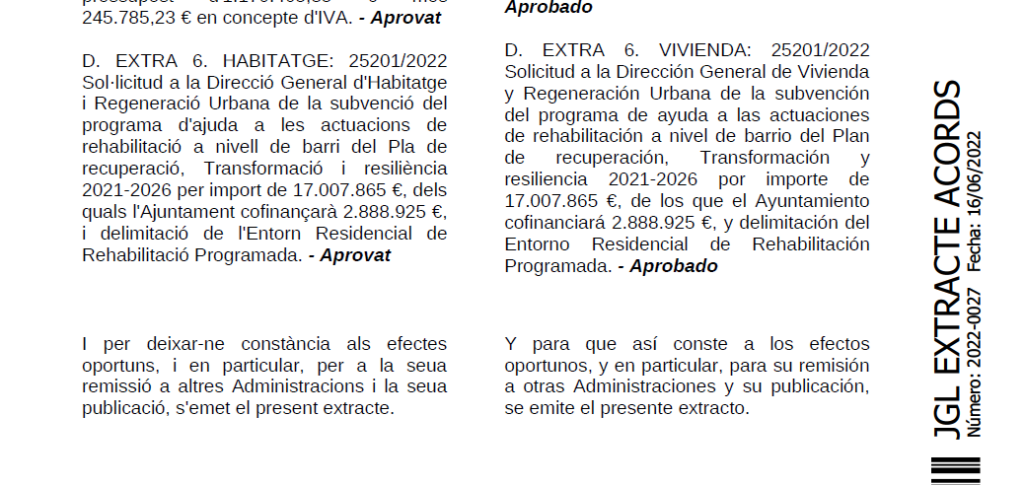 Segons ha pogut saber el Diari La Veu, va ser l’anterior equip de govern qui va incloure dos milions d’euros de fons municipals per complementar els 17 milions d’euros de la conselleria i els fons europeus per tal de garantir la gratuïtat total de la rehabilitació per al veïnat. Tal com es pot llegir a l’extracte de la Junta de Govern Local del 16 de juny del 2022 –o siga amb l’anterior equip format per PSPV, Compromís i Podem-Castelló en Moviment- ja va aprovar-se destinar una partida de 2.888.925 euros per tal de cofinançar «les actuacions de rehabilitació a nivell de barri del Pla de recuperació, transformació i resiliència». De fet, aquesta aportació de fons municipals va ser clau a l’hora que els projectes presentats per Castelló de la Plana obtingueren la màxima puntuació del pla de barris, segons els barems de la conselleria. Els 15 punts que van rebre en l’apartat de finançament es deuen precisament al 15% de finançament municipal aportat, ja que conselleria i ministeri ja cobrien el 85% restant. La capital de La Plana va ser un dels municipis del País Valencià que més fons va captar per a la rehabilitació d’habitatges.