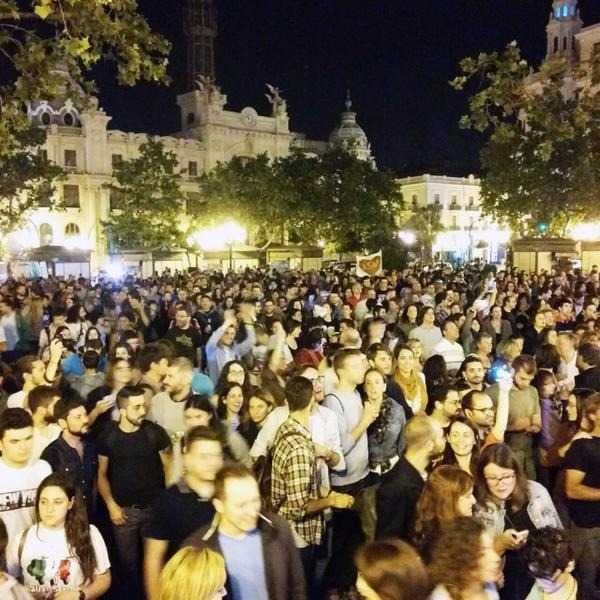 Milers de ciutadans -havien confirmat la seua assistència més 10.000 persones si s’aconseguia l’objectiu- omplin de gom a gom a hores d’ara la plaça de l’Ajuntament de València per festejar que “amb el 78% de vot escrutat, PP+Ciutadans no poden governar al País Valencià. Que creme València!”