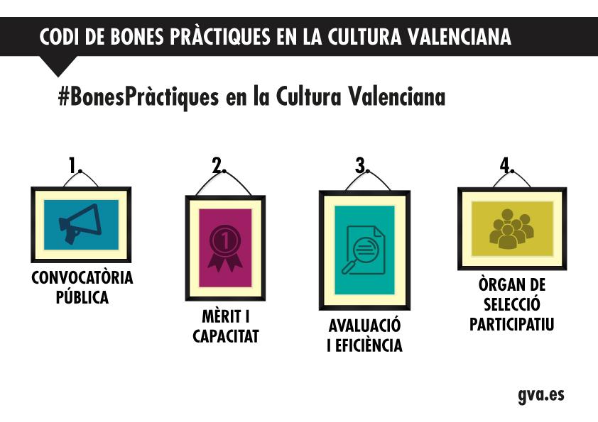 El codi ètic de bones pràctiques en la cultura valenciana naix de la necessitat de resoldre els problemes en els procediments i l’organització que arrossegaven els espais culturals dependents de la Generalitat. El document parteix d’una anàlisi exhaustiva de la situació del sector cultural. Per elaborar-lo s’han mantingut vora un centenar de reunions amb institucions i col·lectius del sector, a més d’una anàlisi dels codis més avançats d’arreu de l’estat i d’Europa. La transparència en la gestió, la participació de la societat i els professionals, l’excel·lència i la universalització de la cultura en són els eixos principals d’aquest codi que regirà a partir de hui els contenidors culturals de la Generalitat. Inscrit dins la intenció del nou Consell d’implantar per sempre criteris ètics en l’actuació pública, el codi naix també amb la vocació que puga ser assolit per la resta d’administracions, diputacions i ajuntaments, fonamentalment.