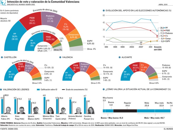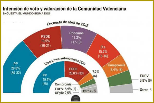 El PP es deixaria més d’un 20% dels vots respecte a 2011 (del 49,4% al 28,8%) i fins a més de 20 escons (de 55 a d’entre 30 i 32). La majoria absoluta està en 55 diputats. L’enquesta confirma la tendència marcada des de fa més d’un any: ni amb crosses de centre dreta (abans UPiD, ara Ciutadans) seguirà Alberto Fabra de president de la Generalitat.