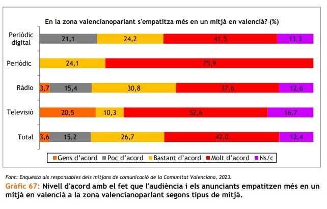 Segons l’estudi, 42 de cada 100 entrevistats estan molt d’acord amb el fet que «el valencià pot conferir a l’empresa o mitjà de comunicació que l’usa d’un halo de proximitat o empatia, ja que no resulta extravagant pensar que aquells que parlen en valencià poden sentir certa afinitat amb aquests mitjans si empren la seua llengua». El 26,7% dels consultats estan bastant d’acord amb aquest principi.