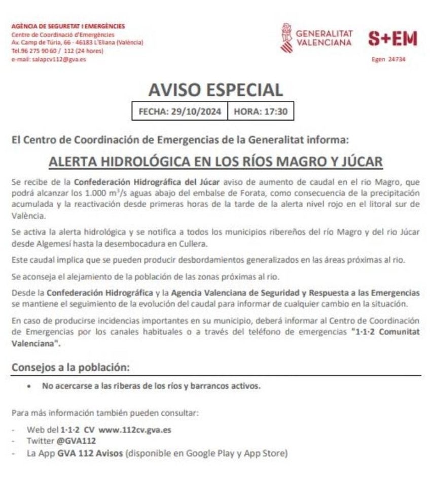 Malgrat aquesta evidència, demostrada també documentalment amb l’avís d’alerta hidrològica emès per la Generalitat aquell dia a l’hora indicada, Mazón insisteix que «no va ser fins a les huit de la vesprada quan es va confirmar la possibilitat imminent que la presa de Forata es poguera desbordar, i ja estaven preparats els tècnics del CECOPI, com a organisme tècnic que és, i també l’enviament de l’ES-Alert», que no es va enviar fins les 20.11 h, quan les riuades ja havien inundat moltes de les poblacions afectades.