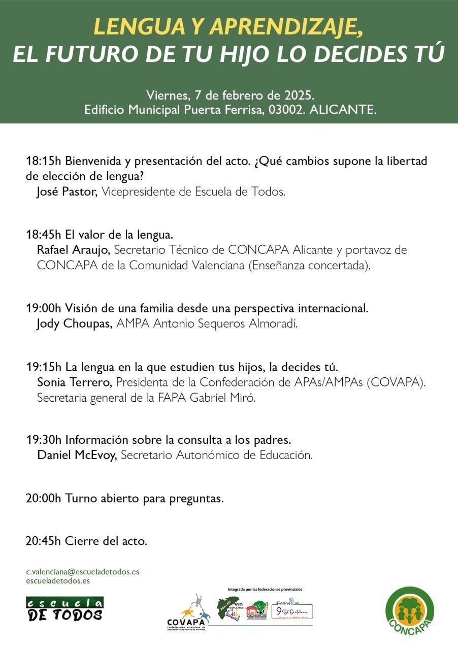 Aquest divendres 7 de febrer a partir de les 18:15 l’entitat Escuela de Todos, constituïda per a «garantir que l’espanyol siga llengua vehicular a tot Espanya», ha organitzat un acte a Alacant, a l’edifici municipal Porta Ferrisa, amb el títol «Lengua y aprendizaje: el futuro de tu hijo lo decides tú».