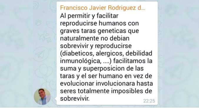 “En permetre i facilitar reproduir-se humans amb greus tares genètiques que naturalment no havien de sobreviure i reproduir-se (diabètics, al·lèrgics, feblesa immunològica, …) facilitem la superposició de les tares i l’ésser humà en comptes d’evolucionar involucionarà fins a éssers totalment impossibles de sobreviure”, va afegir per a tancar el seu argument: “li done [a la humanitat] 5 generacions com a molt”