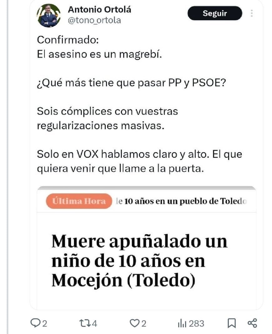 El portaveu de Vox a l’Ajuntament de Castelló de la Plana i regidor de Seguretat Ciutadana, Antonio Ortolá, intenta desviar l’atenció després d’haver hagut d’esborrar un missatge a la xarxa social X en què acusava falsament la comunitat musulmana pel crim comès a Mocejón (Toledo), en què va ser assassinat un xiquet d’11 anys.
