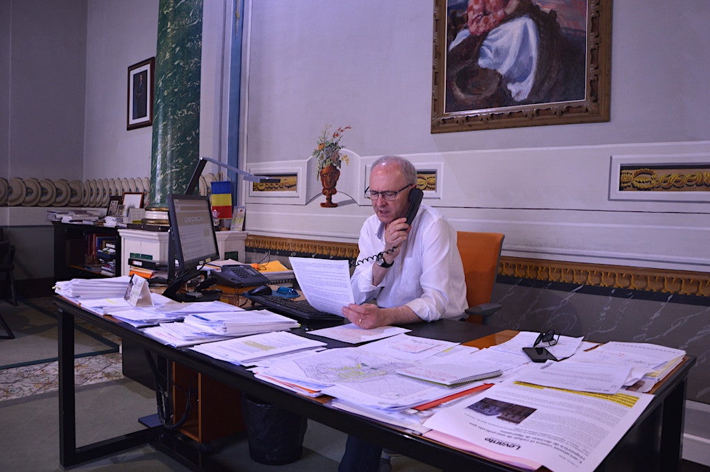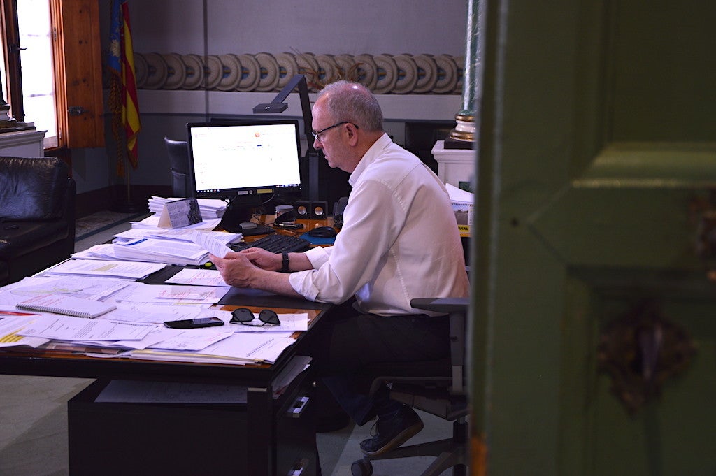 L’alcalde de la ciutat, Paco Salom, rep el Diari La Veu al seu despatx de l’ajuntament. Va arribar a l’alcaldia l’any 2015, després d’uns resultats històrics del seu partit, Compromís, al municipi. En els comicis de 2019 va passar de deu regidors a sis i ara governa en minoria de la mà del PSPV