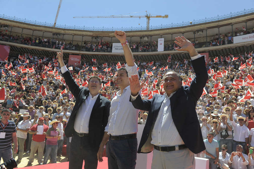 Una plaça de bous, un sol extrem i milers de socialistes donen per a moltes combinacions. Per exemple, veure Joan Lerma i Ciprià Ciscar amb barrets de palla en una barreja impossible entre llauradors a punt de cremar brossa i cowboys de la ribera del riu Arkansas. O també dos exsecretaris generals, Jorge Alarte i Joan Ignasi Pla, descavalcats i varats en eixos laterals traïdorencs de l’escenari sense dret a foto ni palmada en l’esquena. I ja a les 12.00 tot un públic, uns 12.000 assistents, que crepiten com grans d’arròs dins l’enorme paella. De fet, la calor és tan punxeguda que l’única ventilació prové de les consignes que fan agitar les banderoles de plàstic. I pels burladeros hi ha metges voluntaris atents al paisatge humà en fermentació.