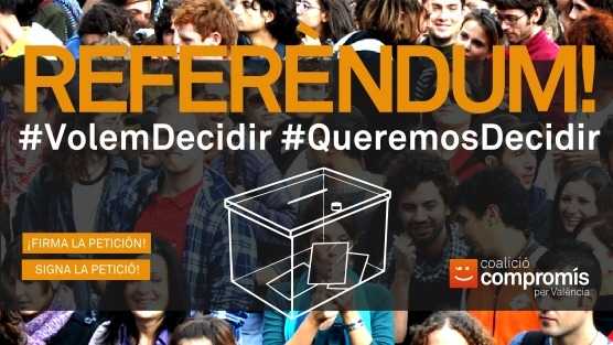 La coalició nacionalista Compromís ha creat en change.org una petició per demanar la convocatòria d’un referèndum en què els ciutadans decidisquen lliurement la seua representació política i institucional. La proposta, dirigida al Congrés, ja compta amb més de 1.500 signatures de recolzament.