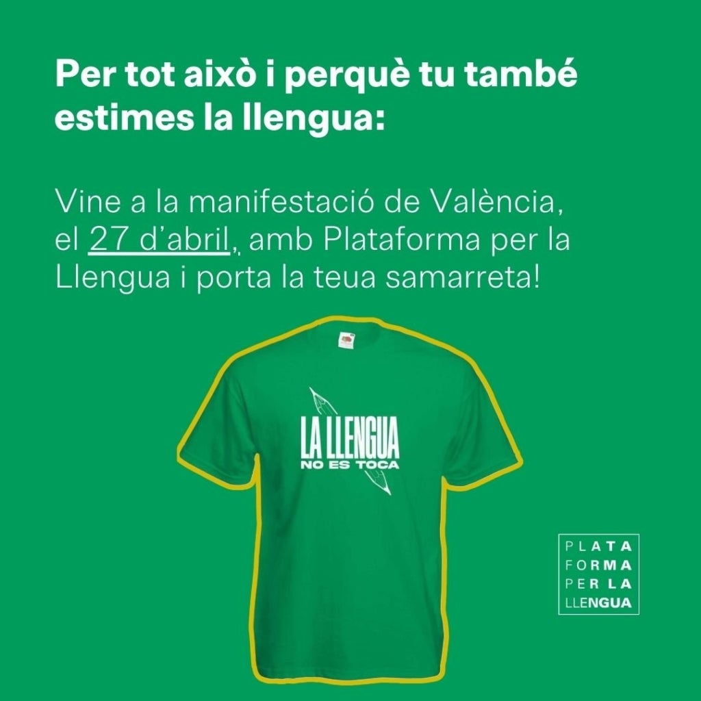 Plataforma per la Llengua ha fet una crida a la mobilització ciutadana per plantar cara a les «polítiques valencianòfobes» impulsades des de la Generalitat Valenciana, governada per PP i Vox. Una de les accions proposades és que cada dijous els ciutadans es posen la camiseta verda que ha dissenyat l’entitat amb el lema «La llengua no es toca» per a «denunciar la censura, defensar els drets dels valencianoparlants i reclamar l’educació en valencià».