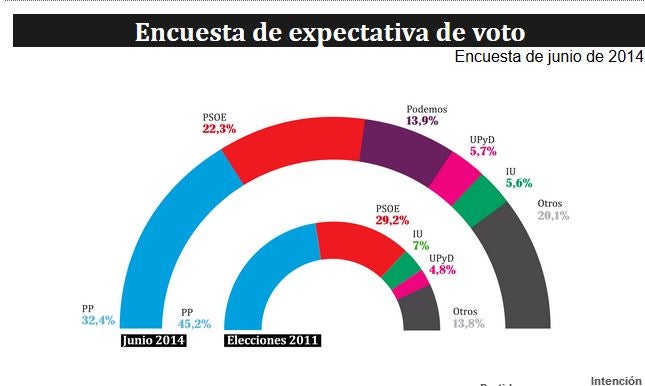 Una enquesta realitzada pel diario.es confirma l’enorme irrupció de Podemos en el panorama polític estatal. Així, el partit de Pablo Iglesias arribaria al 13,9% dels vots, i doblaria així els percentatges d’IU (5,6%) i UPyD (5,7%).