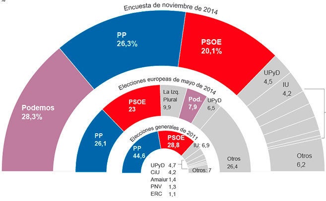 L’ascens de Podemos ha sigut meteòric, com una explosió. Un autèntic ‘big bang’. Al maig passat, en els comicis europeus, Podemos sorprenia al país collint 1,2 milions de vots, el 7,9% dels sufragis, que li permetien estrenar-se en el Parlament d’Estrasburg amb cinc escons. Tres mesos després, a la fi d’agost, l’enquesta de principi de curs d’El Mundo, multiplicava quasi per tres la seua intenció de vot -fins el 21,2%-, la qual cosa el situava com la tercera opció política a només un punt del PSOE i a nou del PP. Hui, aquest fet es consuma i no solament sobre els socialistes; també sobre els populars.
