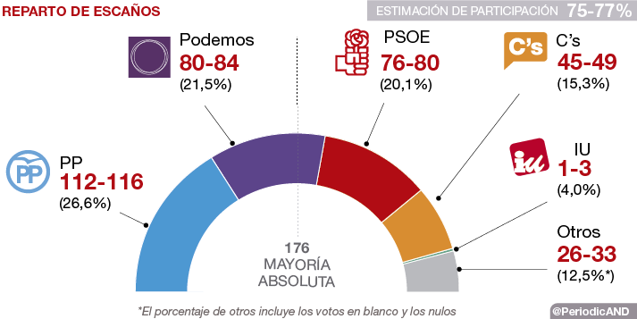 El Partit Popular guanyaria les eleccions d’aquest diumenge amb 112-116 diputats (actualment en disposa de 186), ja que arriba a la decisiva jornada electoral del 20-D afermant una estimació de vot del 26,6%.