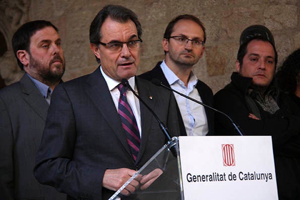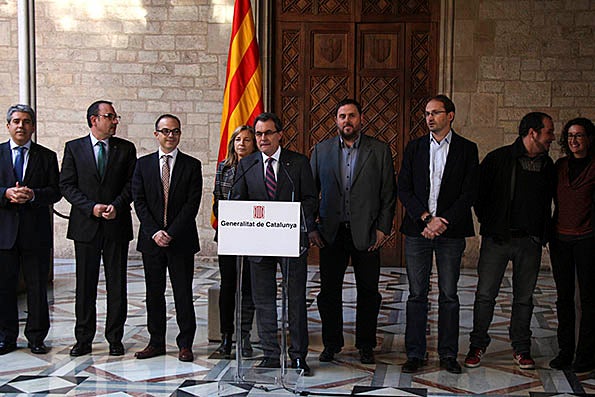 En la compareixença acompanyaven Mas el conseller de la Presidència, Francesc Homs; la vicepresidenta, Joana Ortega; el president del grup parlamentari de CiU, Jordi Turull; el president del consell nacional d’UDC, Ramon Espadaler; el president d’ERC, Oriol Junqueras; la secretària general dels republicans, Marta Rovira; el coordinador nacional d’ICV, Joan Herrera, Joan Mena en representació d’EUiA, i David Fernández per part de la CUP.