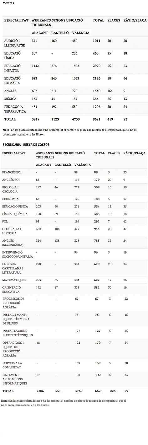 Demà comencen les oposicions en el cos de mestres, en els cossos de secundària i en inspecció educativa. En total s’hi presenten 16.297 aspirants per a 645 places, amb una ràtio global, per tant, de 25 aspirants per plaça. En els quadres adjunts s’especifiquen les ràtios per especialitats.