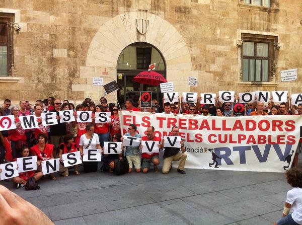 El Comitè d’empresa de RTVV havia convocat aquesta concentració enfront del Palau de la Generalitat, on se celebra el primer ple del Consell després de l’estiu, en la qual es va guardar un minut de silenci en protesta pel tancament de la societat autonòmica.