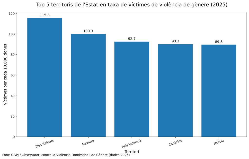 Les Illes Balears encapçalen el rànquing estatal de víctimes de violència de gènere per cada 10.000 dones en 2025, amb una taxa de 115,8, seguides de Navarra, amb 100,3. El País Valencià ocupa la tercera posició, amb 92,7 víctimes per cada 10.000 dones, per davant de Canàries, amb 90,3, i Múrcia, amb 89,8. Aquestes dades, recollides pel Consell General del Poder Judicial, situen el País Valencià entre els territoris amb una incidència més alta de la violència masclista a l’Estat.