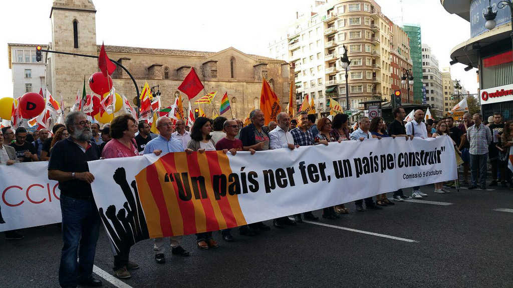 “Què dieu? Molta gent?”, ho preguntava Toni Gisbert, d’Acció Cultural del País Valencià, en eixe moment esotèric de la comptabilitat a colp d’ull. Vora 3.000 persones s’escampen en diverses pancartes i molts metres buits pel carrer Colom. La clàssica manifestació independentista de les vesprades del Nou d’Octubre desemboca desmaiadament al Parterre. Les pancartes embolcallen el pedestal de Jaume I i una veu passa llista d’associacions, coordinadores, plataformes, sindicats, entitats cíviques, partits polítics i les corresponents escissions. Una suma cívica de molta retòrica i poca abundància. Sense el PP, el carrer descansa.