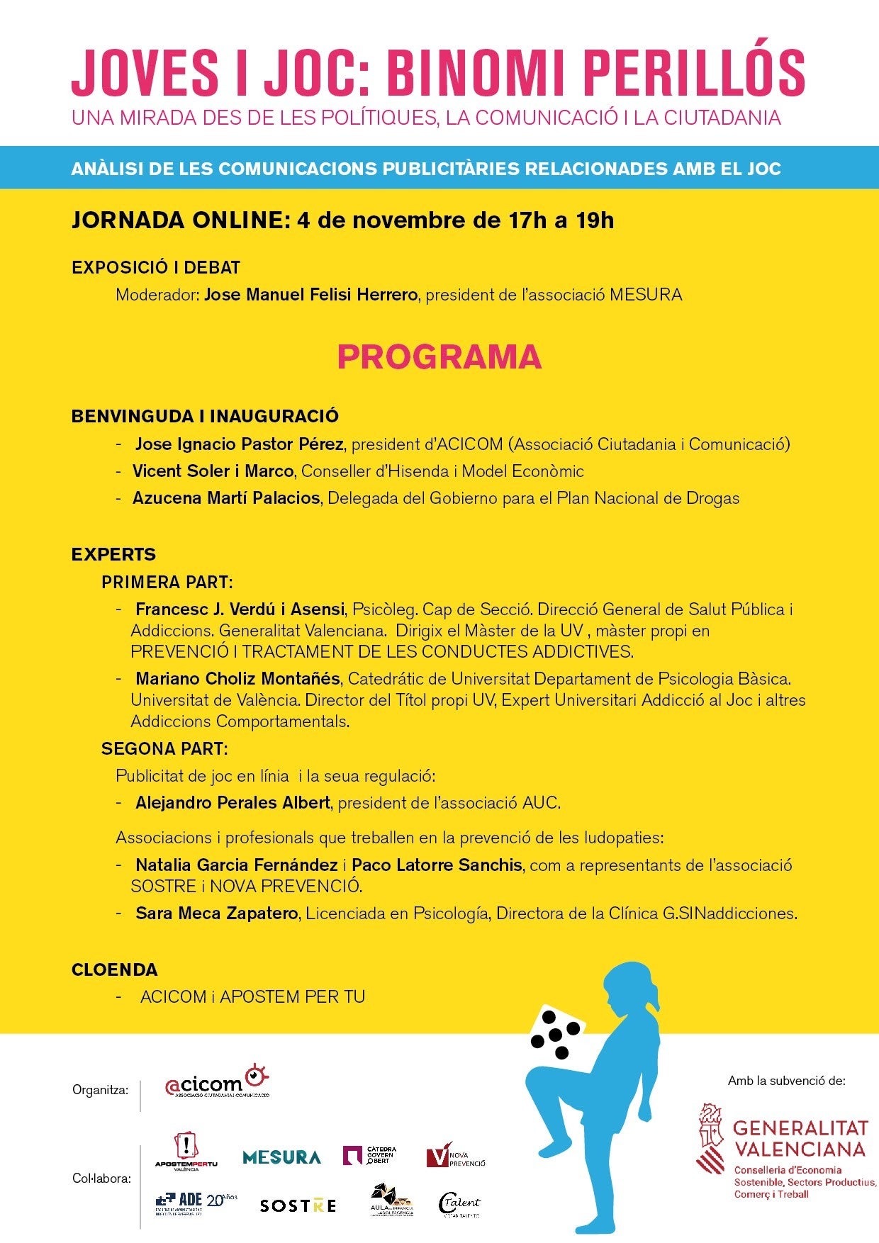 L’Associació Ciutadania i Comunicació (ACICOM), una entitat dedicada a crear iniciatives de promoció del pensament crític, celebra aquesta vesprada la jornada en línia «JOVES I JOC: BINOMI PERILLÓS. Una mirada des de les polítiques, la comunicació i la ciutadania». L’esdeveniment tindrà lloc a les 17h de forma gratuïta per a tothom qui s’hi inscriga prèviament. A l’acte, experts tractaran diferents aspectes relacionats amb la comunicació comercial del joc, una qüestió amb moltes implicacions socials en l’actualitat, ja que l’augment dels problemes relacionats amb les ludopaties en els darrers cinc anys han augmentat la seua incidència en un 60% entre la població i cada vegada afecten més a les persones joves.