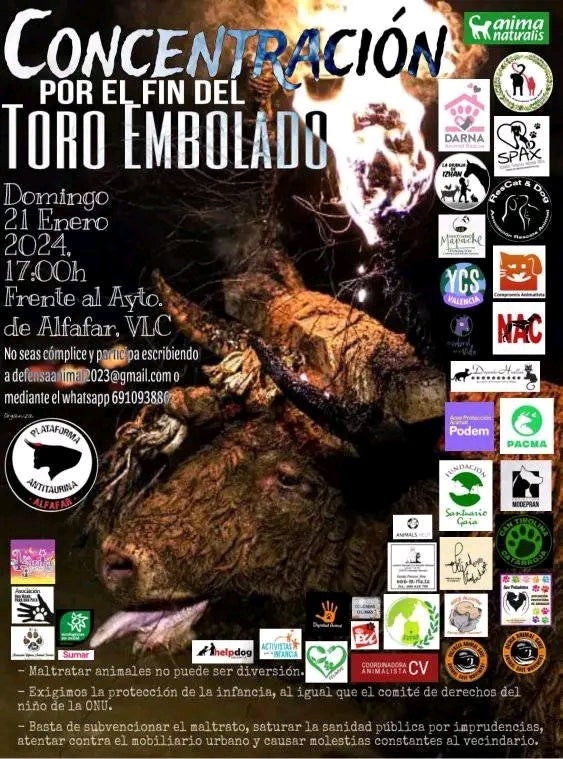 La Plataforma Antitaurina d’Alfafar (Horta Sud) ha convocat un nou acte davant l’Ajuntament d’aquesta localitat el pròxim diumenge 21 de gener.