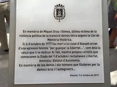 El consistori «opta per la desmemòria i la negació d’uns fets inqüestionables: Grau va ser assassinat per un feixista per apegar cartells del 9 d’octubre del 1977». Uns fets el relat dels quals «s’indicava en la primera placa». Ara «l’Ajuntament instal·la un memorial sense informació» perquè vol «amagar la veritat i negar-la a la ciutadania d’Alacant». D’aquesta manera, «assassinen per segona vegada Miquel Grau, tornen a castigar la família i fugen del compromís democràtic».