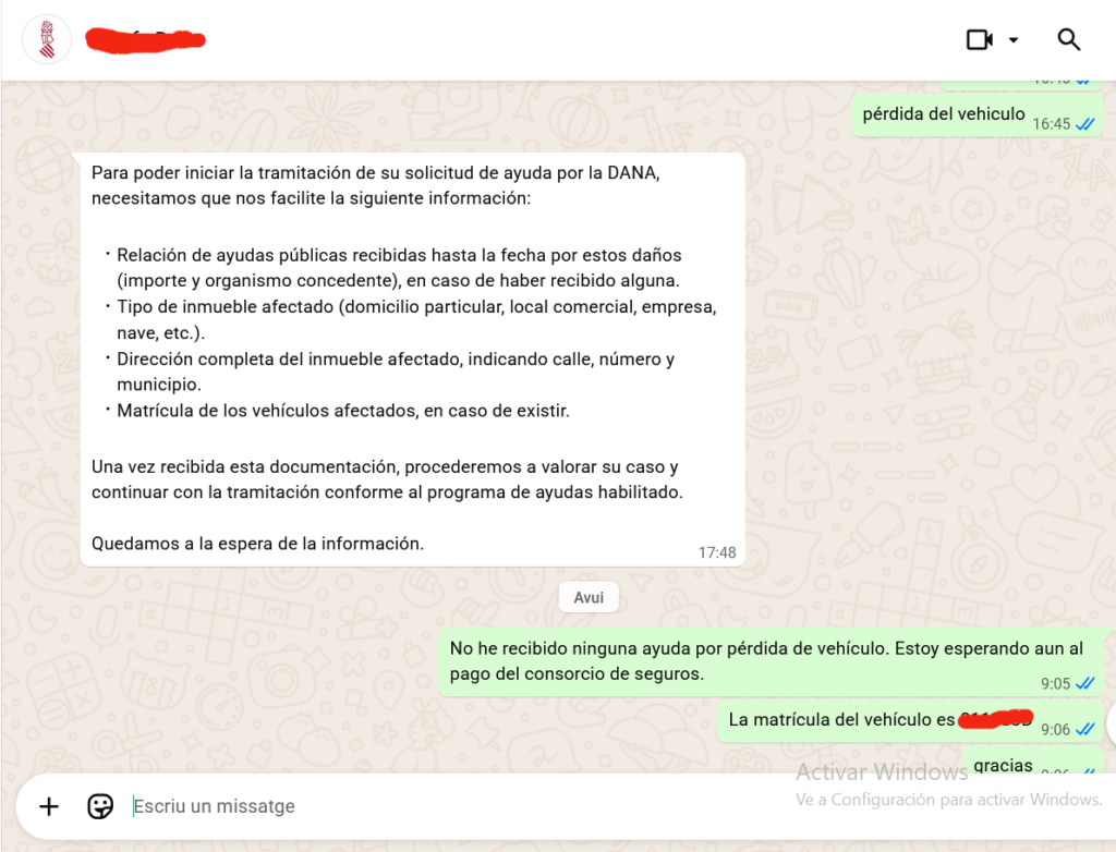 En tots dos experiments, la resposta ha estat la mateixa. Un missatge automàtic -sempre en castellà- assegura que és “el canal oficial d’informació sobre les ajudes per la DANA” i demana dades com els noms, municipi i danys que s’han patit”. Responem insistint i aportant les dades qe requereix. Un segon missatge demana més detalls com ajudes públiques ja rebudes, tipus dels bens afectats o adreces o matrícules dels immobles o vehicles danyats. Tornem a respondre omplint els detalls demanats.