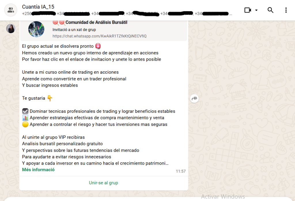 El grup tampoc té més activitat -curiosament tampoc baixes- que els missatges regulars de Sofia Silva amb suposada informació financera i un enllaç per formar part de la “Comunitat d’Anàlisi Borsària”. Ningú ha respost a les preguntes de més informació sobre el grup o com i per què s’hi ha inclòs el meu número. Un intent de posar-se en contacte per privat amb altres membres tampoc ha donat resultat, per ara.