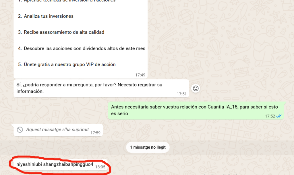 Seguim. Ara preguntem directament per a qui són. Per primera volta en tot el procés hi ha la sensació que respon un ésser humà, encara que la conversa és aspra. Exigeix les respostes a les preguntes de forma immediata i incisiva, i al mateix temps intenta evitar respondre a les qüestions sobre l’objectiu del grup, els serveis que es presten o la relació amb el primer grup, Cuantia IA_15. A partir d’ací la comunicació deixa de ser fluïda i l’últim missatge és, literalment, “niyeshiniubi shangzhaibanpingguo4”.