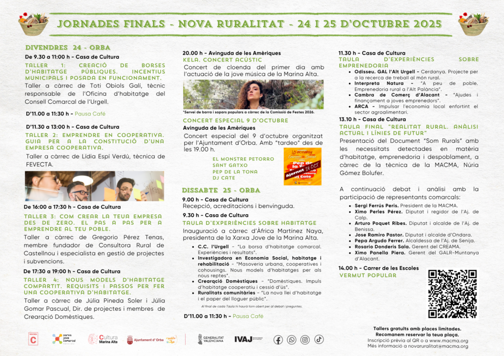 Orba acull divendres i dissabte la segona edició del Fòrum de la Nova Ruralitat a la Marina Alta, una trobada que s’ha consolidat com un espai de reflexió, innovació i acció sobre el futur de les zones rurals. Enguany, les jornades posen el focus en dos grans reptes: l’accés a l’habitatge i l’emprenedoria juvenil, considerats pilars fonamentals per garantir una ruralitat viva i sostenible.