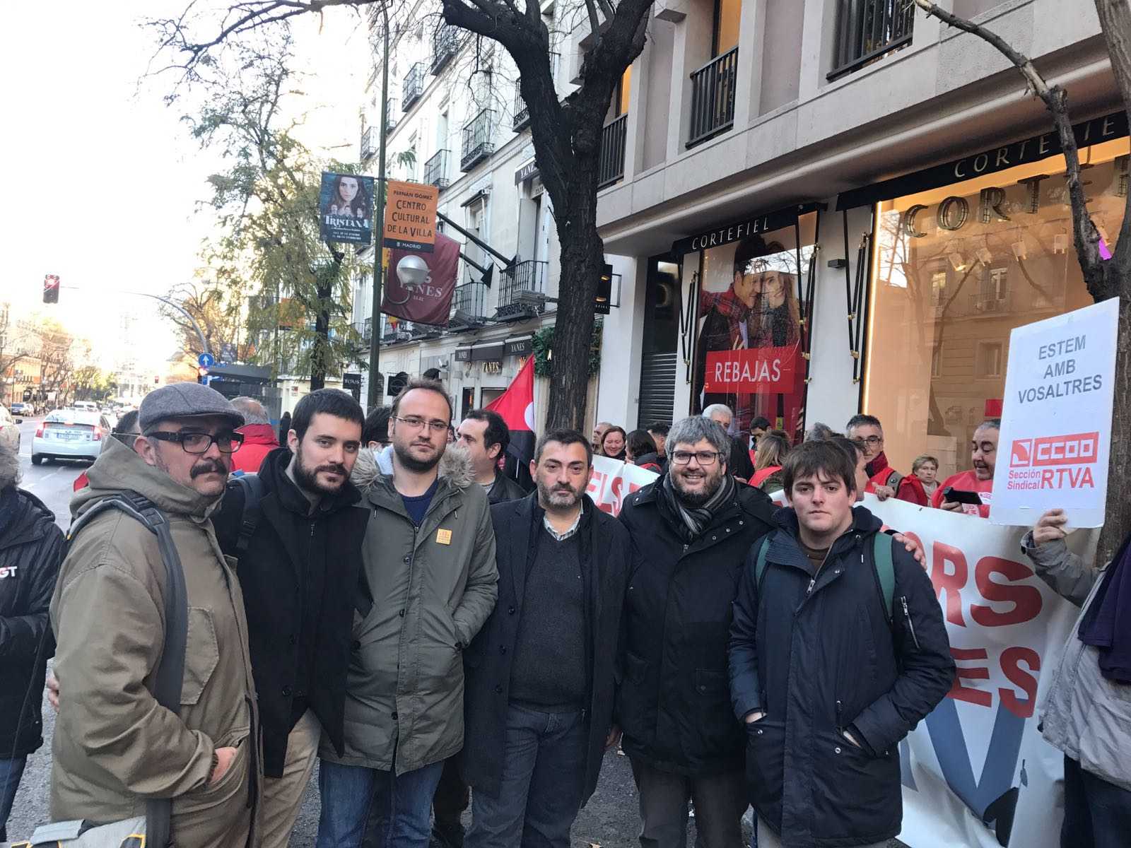 Representants d’Esquerra Republicana han fet costat aquest matí a Madrid als treballadors i treballadores de Radiotelevisió Valenciana i el seu Comitè d’Empresa en l’inici del judici de l’ERO d’extinció de RTVV celebrat a l’Audiència Nacional. En la concentració convocada pels treballadors hi ha participat el president d’Esquerra Republicana del País Valencià, Josep Barberà; el vicesecretari de Coordinació Territorial d’ERPV, Francesc Sanxis, així com els senadors Josep Rufà, Jordi Martí i Bernat Picornell i el Portaveu Nacional de les JERC, Pau Morales.