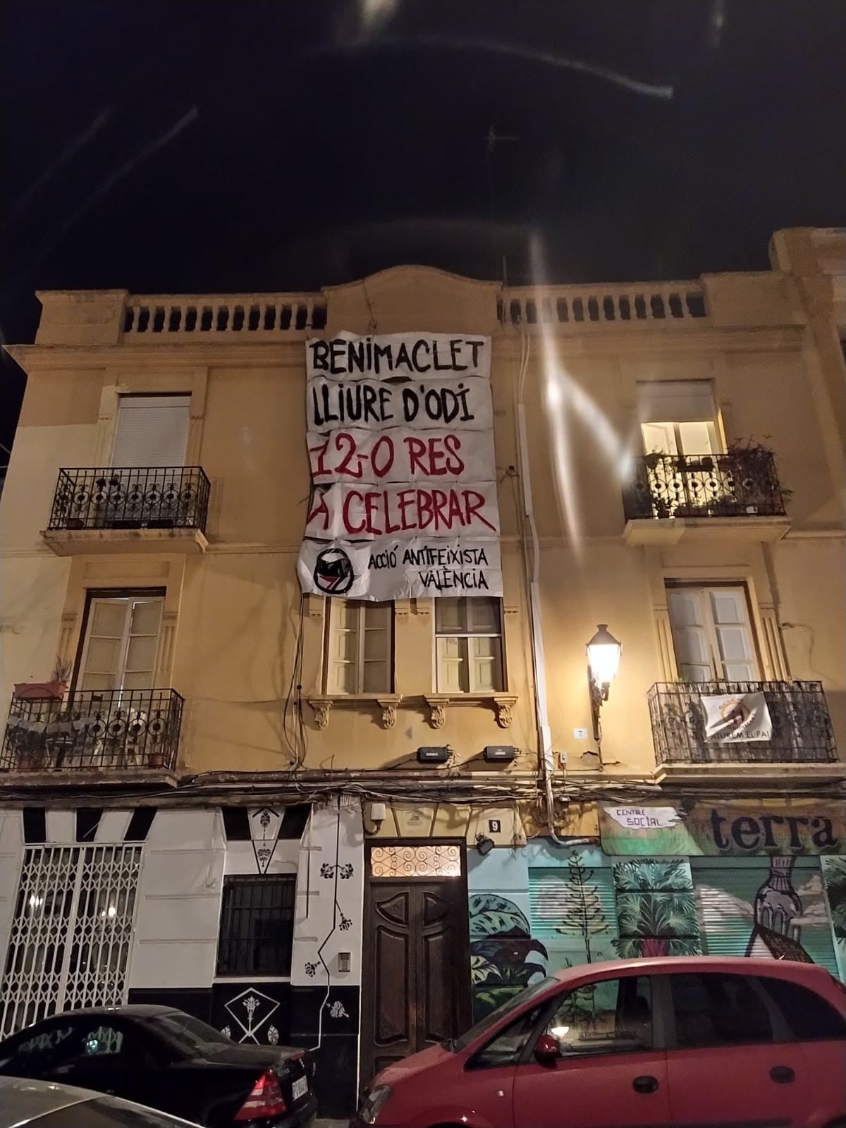 I allí estaven, la gran majoria, com els hem relatat, retinguts més enllà de les vies del metre. Però, els feixistes no comptaven que, en aquest barri, combatiu i solidari, d’insubmís teixit veïnal, l’antifeixisme està fins i tot en les teulades. Les casseroles van sonar des dels balcons al seu pas, cosa que van interpretar els feixistes ridículament com una forma de suport a la seua causa, la d’enderrocar el Govern Estatal, i al seu torn es van desplegar pancartes amb missatges feministes, anticapitalistes i antiracistes. Entre aquestes cal assenyalar la que va lluir en la façana de l’edifici que alberga el Centre Social-Bar Terra en el Carrer del Baró de San Petrillo, pancarta monumental despenjada per un grup de 9 antifeixistes que, amb el Bella Ciao de Talco de fons, i assetjats des del cel per l’helicòpter de la Policia Nacional, van transmetre el següent missatge a les ordes de l’odi: “Benimaclet lliure d’odi, 12-O, res a celebrar. Acció Antifeixista València”.