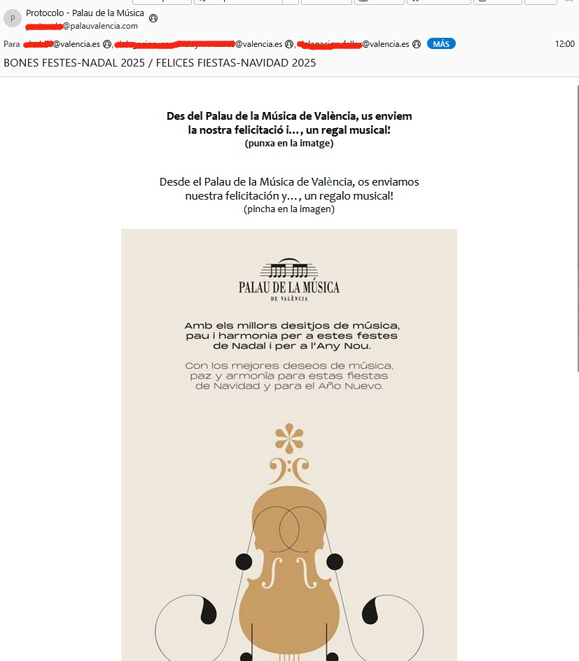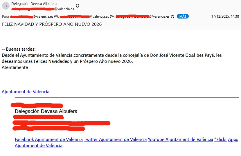 Des d’aquest departament va enviar-se a tots els seus contactes del correu un desig de “bones Festes i Pròsper Any nou 2026”. El problema comença quan qualsevol dels beneficiats pels bons desitjos pot comprovar, no s’ha pitjat l’opció de còpia oculta – com és habitual i obligat legalment- com totes les adreces estan a la vista de tots els qui han rebut el correu.