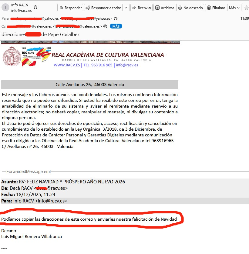 I és que en una resposta a totes les adreces de correu de la llista de la regidoria, el degà de la institució Luis Miguel Romero dona instruccions a algun subordinat: “Podríem copiar les adreces d’aquest correu i enviar-los la nostra felicitació de Nadal”. Amb tan mala sort -o manca de destresa digital- que les instruccions pirates -i presumptament il·legals- de Romero no només arriben al subordinat, sinó a totes les adreces piratejades. Ja sabeu, recordeu sempre de fixar-vos que no esteu “responent a tots” quan envieu un correu, sobretot si el contingut té un punt vergonyant.