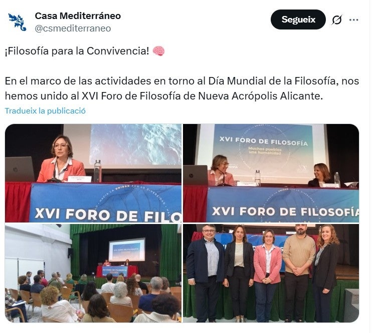 Casa Mediterráneo va publicar a X un missatge en què celebra la seua presència al “XVI Foro de Filosofía” organitzat per Nueva Acrópolis Alacant, coincidint amb el Dia Mundial de la Filosofia. “Filosofia para la Convivència!” i “ens hem unit al XVI Foro de Filosofia de Nueva Acrópolis Alicante”, diu textualment la piulada, acompanyada de quatre fotografies de la jornada. La publicació es va fer el passat dia 8 de novembre.