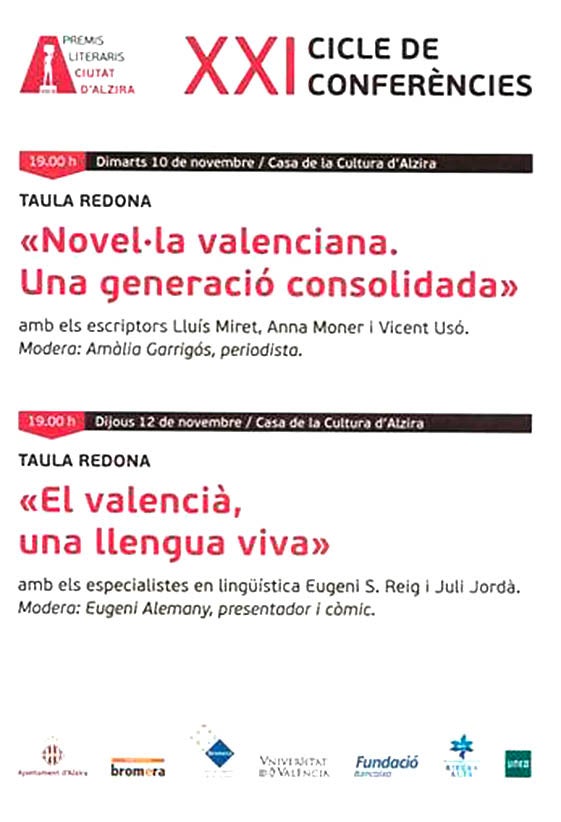 El Cicle de Conferències dels Premis Literaris Ciutat d’Alzira 2015, continua i finalitza aquesta setmana amb noves activitats. Es tracta d’una proposta cultural programada per la regidoria de Cultura de l’Ajuntament d’Alzira, amb la col·laboració d’altres entitats. Aquest cicle de conferències és gratuït i obert a qualsevol persona interessada, siga docent o no.