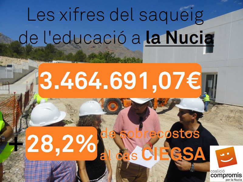 Així, els sobrecostos totals de CIEGSA a la Nucia arriben a suposar “l’escandalosa xifra de 3.464.691,07”, i una desviació del 28,2%, xifra que en paraules de Pep Pastor, portaveu del Grup Municipal de Compromís per la Nucia, suposa la “marca de la vergonya, per la qual van condemnar diverses generacions d’alumnes nuciers a estudiar en barracons i en males condicions per culpa de la seua corrupció i saqueig. Per si no fóra poc, van construir els tres centres menuts i en aquests pocs anys que han passat ja han tingut diverses reformes i ampliacions, totes pagades per l’ajuntament. Per acabar-ho d’adobar, van arribar a haver barracons a l’Institut vell i també en el nou, només 2 anys després de la seua inauguració.”