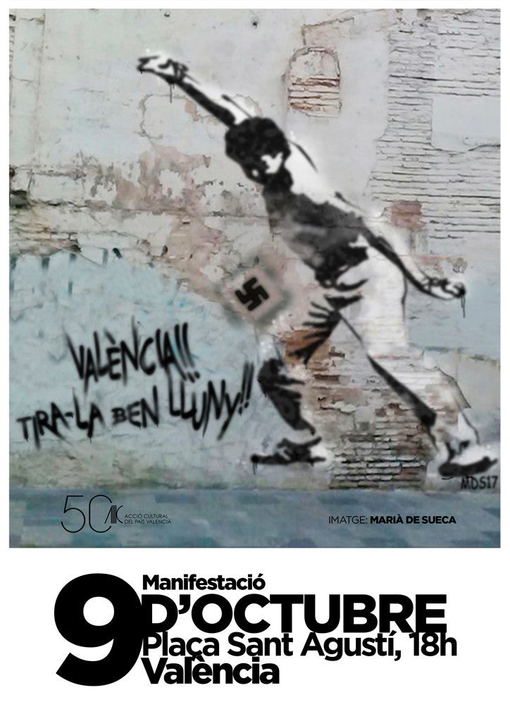 Acció Cultural del País Valencià (ACPV) ha convocat la tradicional manifestació nacionalista a la plaça de sant Agustí a les 18 h. El recorregut acabarà, com és habitual, al Parterre. Enguany, el cartell de la convocatòria està basat en una imatge digital que naix de la mà de Marià Pérez i Claver, Marià de Sueca, que ha cedit el dret d’ús d’aquesta a ACPV «per representar simbòlicament el treball per la llengua i la cultura dels valencians, i pels valors cívics del diàleg, la democràcia i les llibertats», ha manifestat l’entitat.